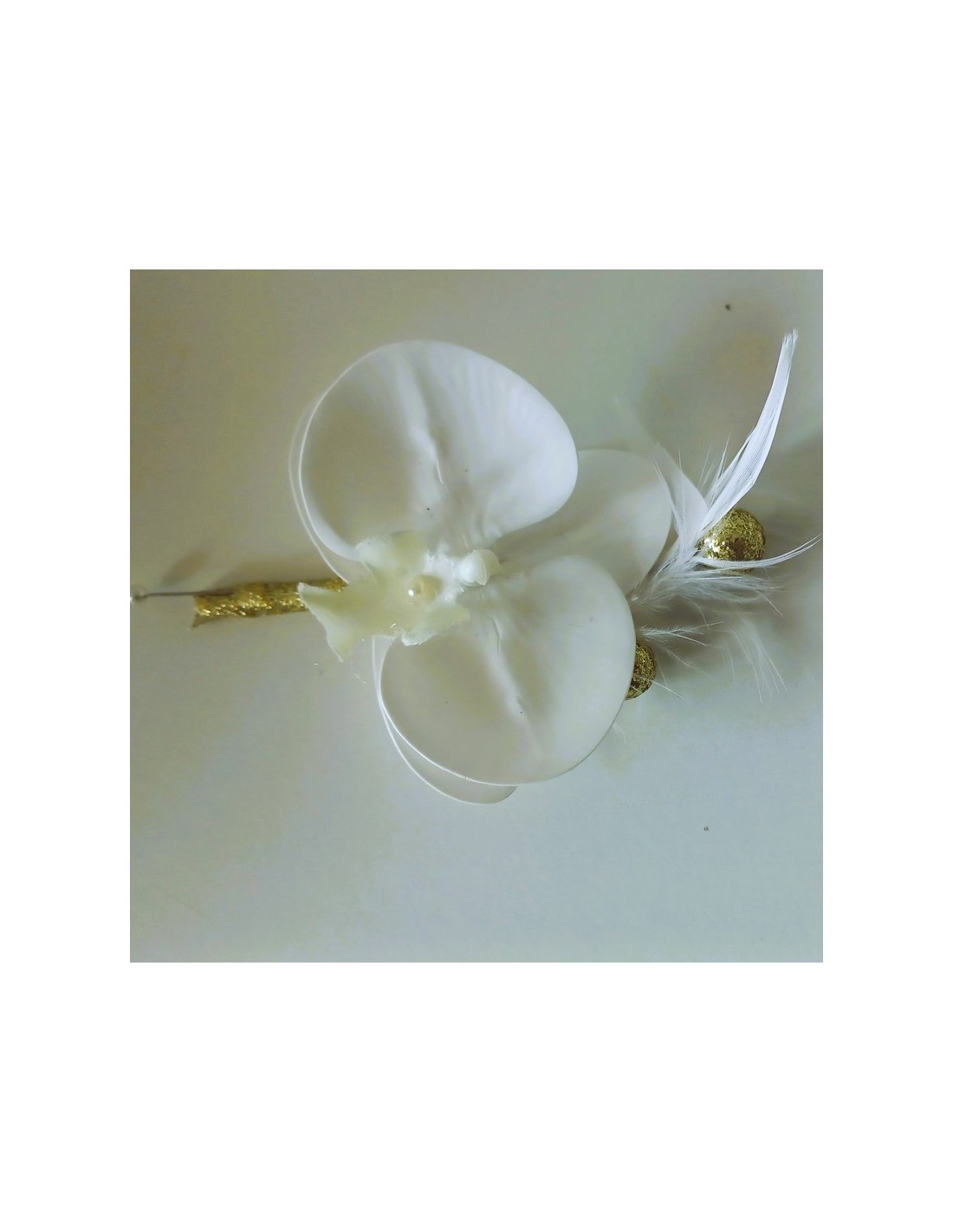 La boutonnière est faite avec une orchidée blanche, plumes blanches, perles dorée et ruban couleur or