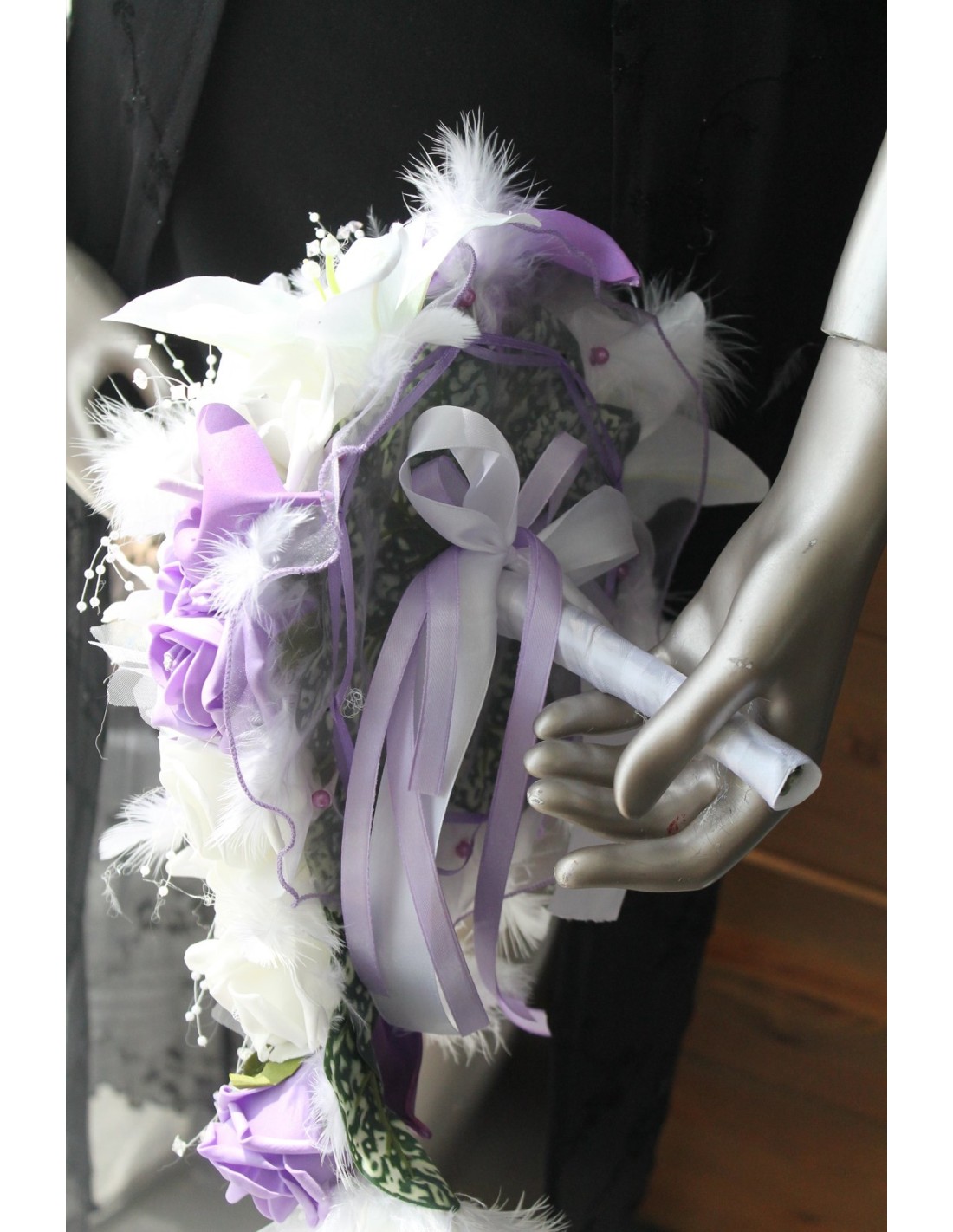 - Bouquet de mariée tombant fait avec des roses, lys et arums couleur ivoire et parme, des plumes, perles et tulle couleur ivoire et des strass.