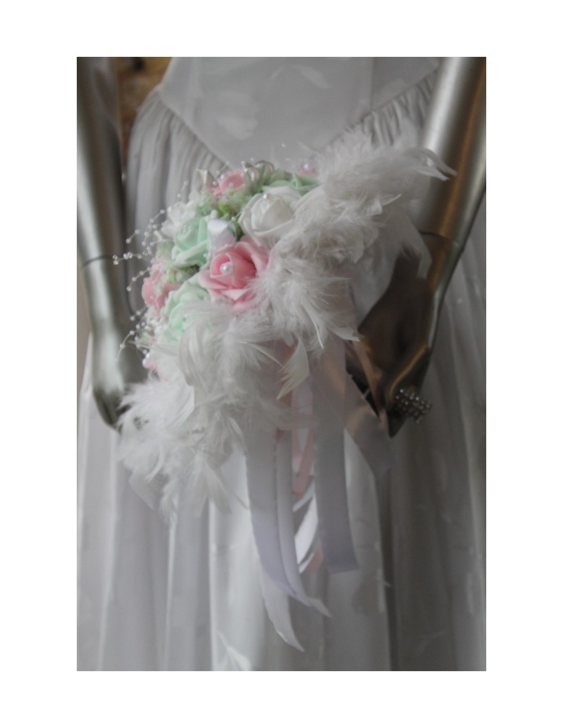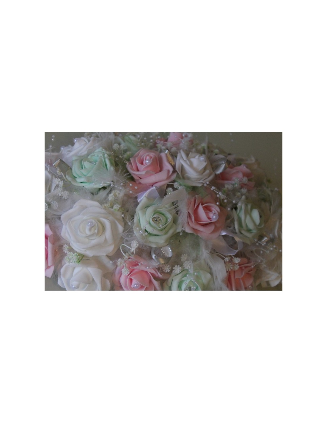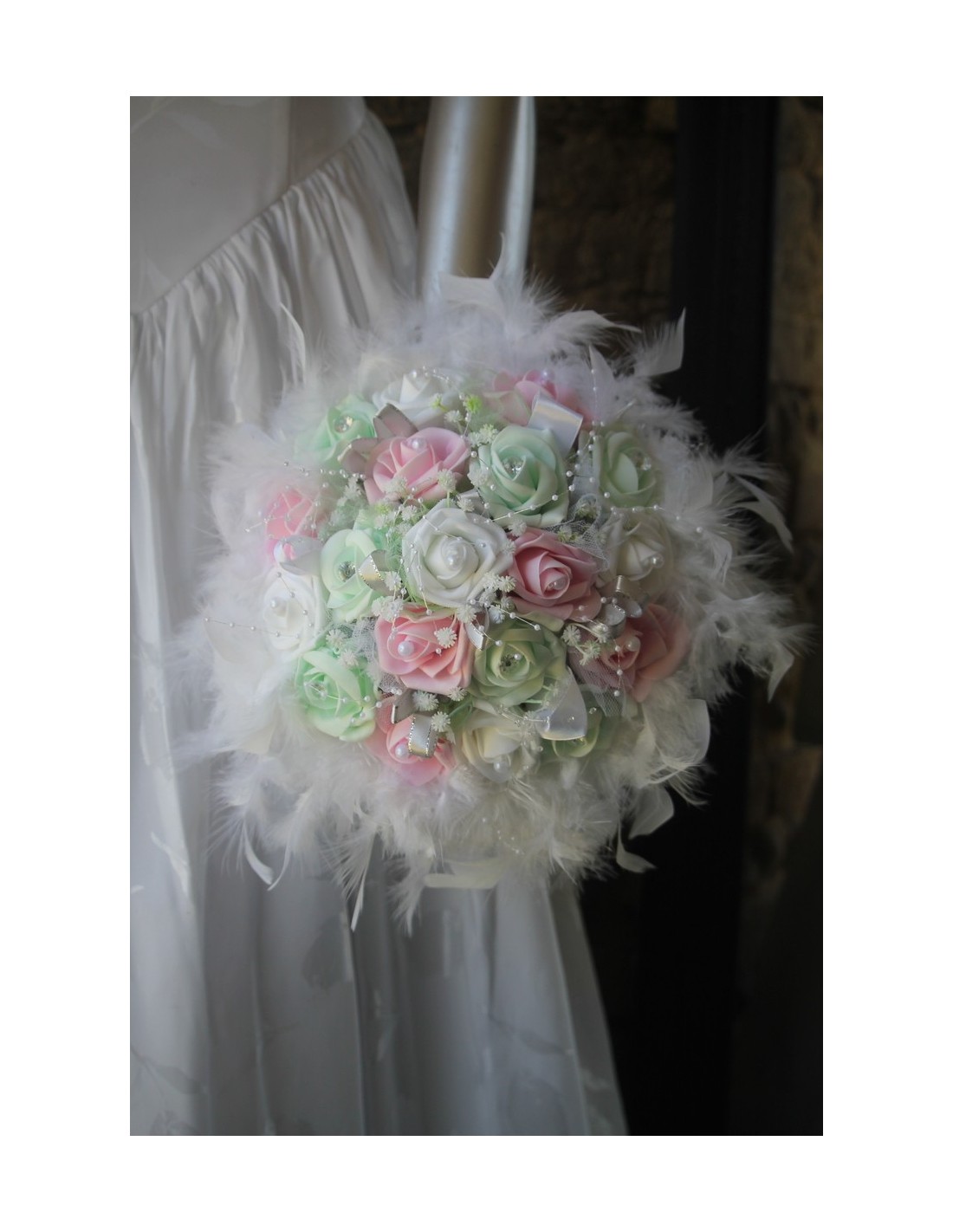 Bouquet de mariée composé de roses couleur blanc, rose et vert pastel, du gypsophile, des perles, des strass, de tulle blanc et vert, ainsi que de plumes blanches. Diamètre : 25 cm.