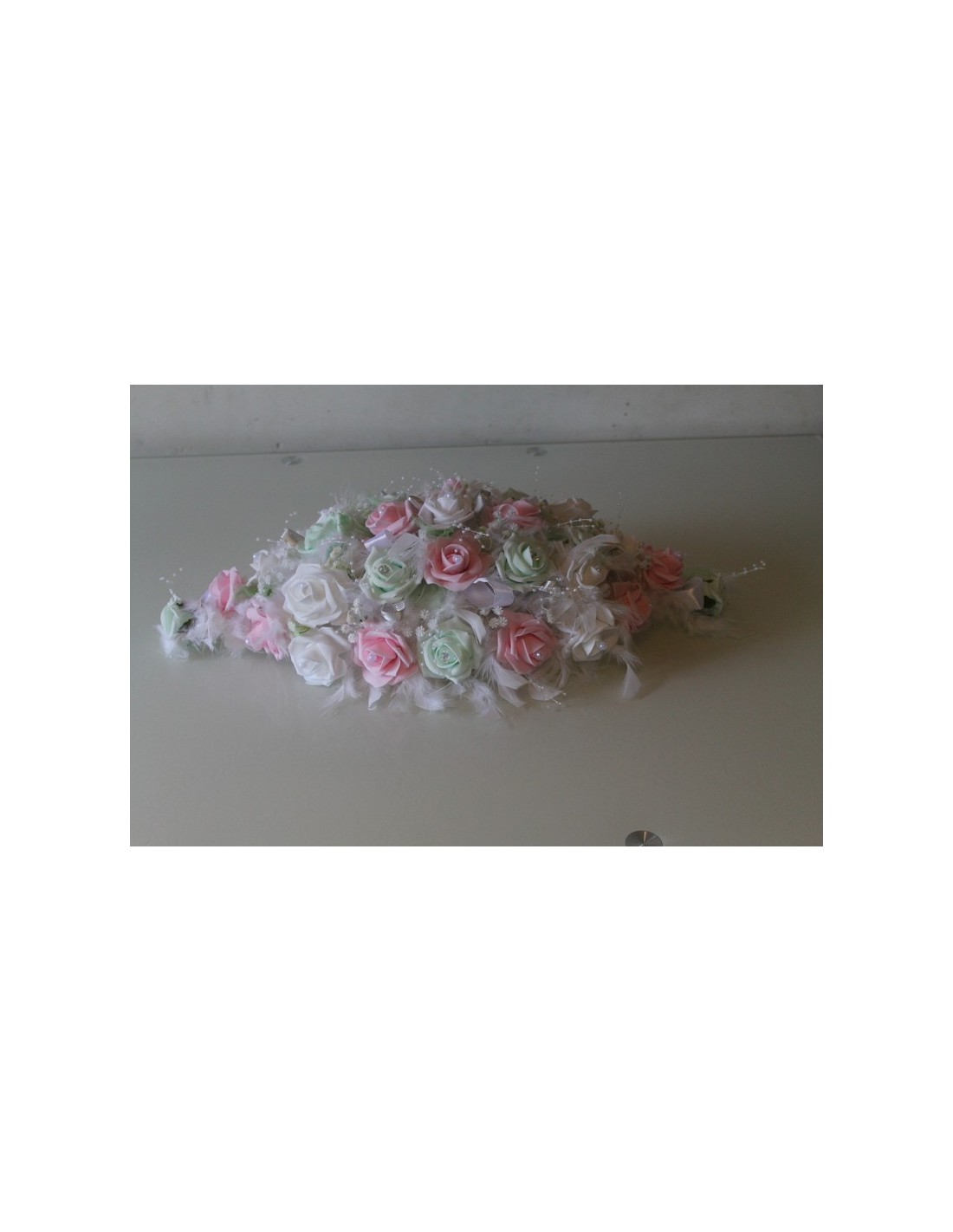 Composition florale de table, composé de roses couleur blanc, rose et vert pastel, du gypsophile, des perles, des strass, du tulle blanc et vert, et des plumes blanches. Longueur : 60 cm.