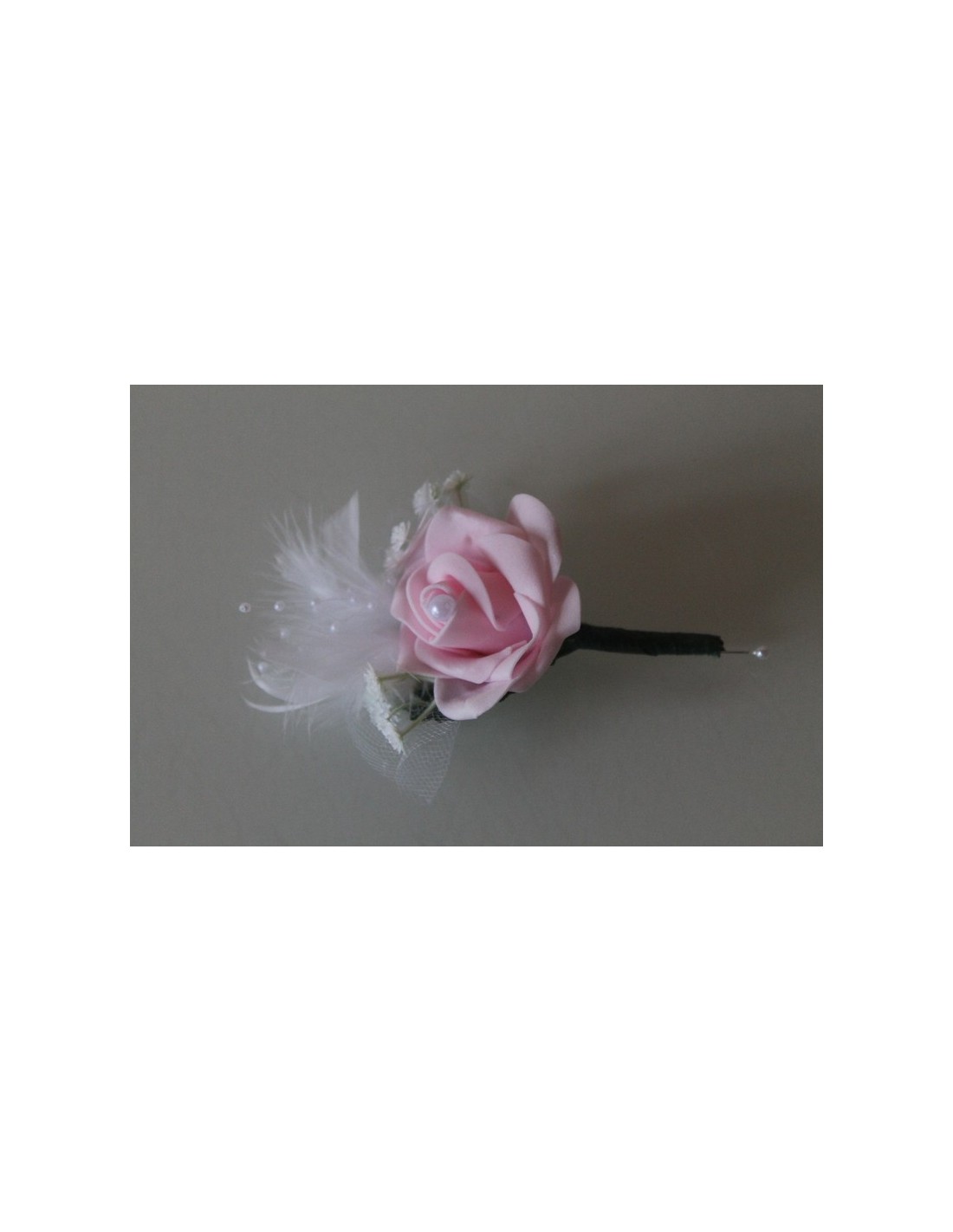 Boutonnière assortie, réalisée avec une rose couleur rose, du gypsophile, des perles et des plumes blanches.